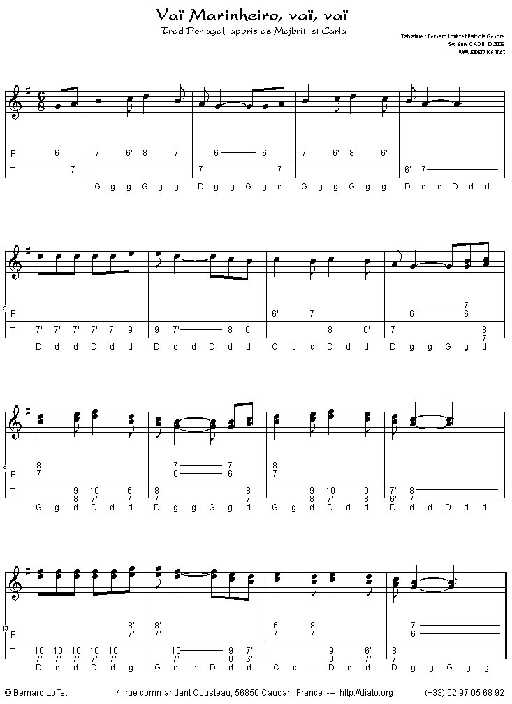| First visit ?  Got problems ?  Please take the time to read this little introduction ! I offer you several tablatures for diatonic accordion or melodion (GIF & PNG files), with midi & abc files, that you may download and print for your personal use. Tablatures are written with the most common universal system (C.A.D.B. system.), and are written for a C/G, A/D, C/F or G/D melodion. The use of these tablatures for workshops (or other public use) must be agreed to by Bernard Loffet. Links to this page are welcome, but don't copy and publish files from this page on your website. Tunes are free of rights, traditional music, or old tunes free of rights now. If I've made a mistake and published a non-free of rights tune, please write to me and I'll delete it. How does it work ? Simply select the tune you want, click on the link and it opens in a new window, then click right (or long click for Mac users) on the tablature and save it and/or print it. Set your browser's margins to 0 before printing (the tab already has margins) or select a page ratio that fits your printer in "preview". Sometimes you'll need to load the tablature in a photo/image program to match your printer's width... In case of problems, check in the FAQ first : you'll find a lot of answers to your questions !!! The PNG files are more compact than the GIF files, and this file format is free of rights. The newest tabs are also in PDF, the best quality for printing... You'll find the "Adobe Reader" link (to read & print PDF files) in the utilities section. MIDI & ABC files will help you to choose the tune or to learn it by ear... Some tunes I play are also recorded in MP3. Sometimes you'll need to stop the midi file that's running (the control pad  is at the top of the page, on the left of the Navigation Menu). I'm sorry, the comments are in French only... When I write a new tab someone has asked for (send me ideas...), I upload it on the website : I don't send it by mail. Visit the beginner's corner. Oh, and just a thing : it's completely free... Bernard Loffet |